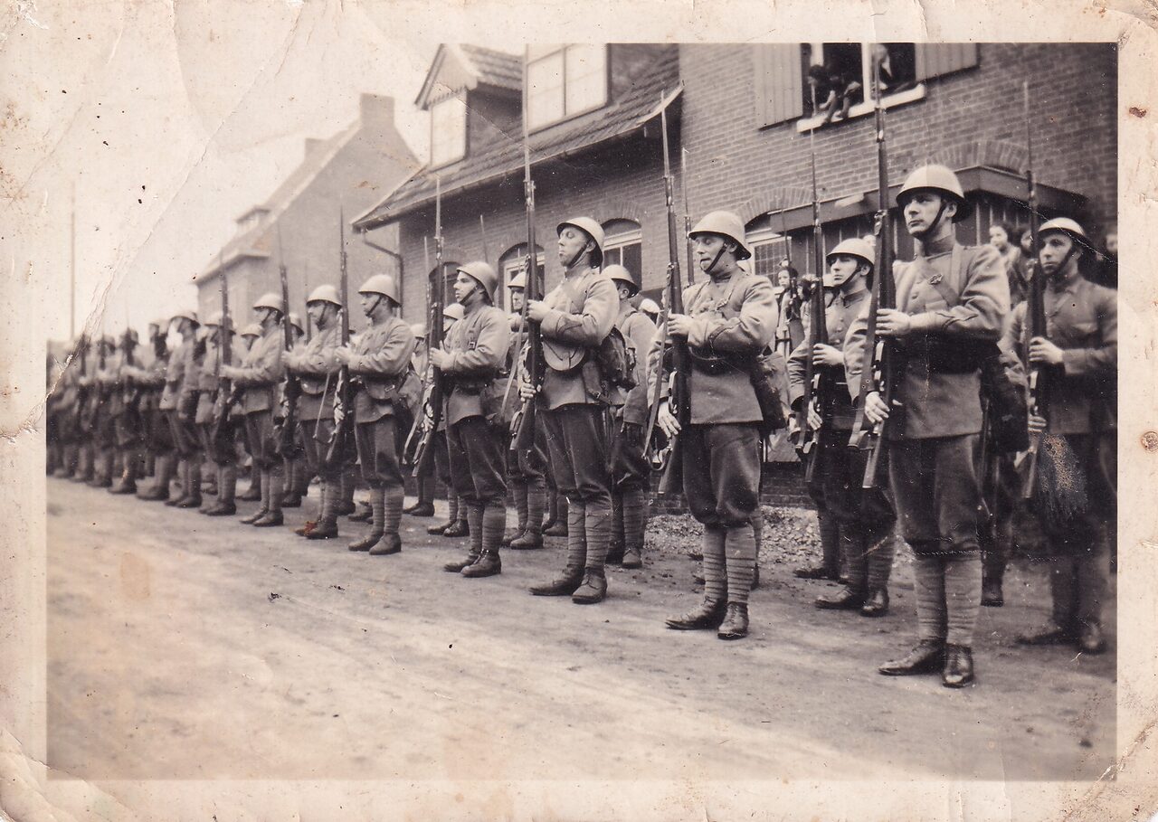 28 februari 1940: gemobiliseerde Nederlandse troepen bij het gemeentehuis aan de Hoogbeek van Schin op Geul tijdens het bezoek