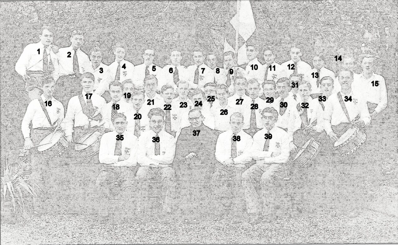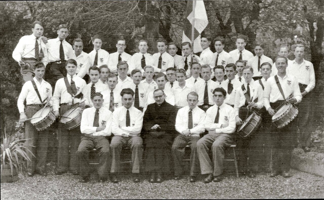 Groepsfoto van Katholieke Arbeidersjeugd (KAJ) uit 1947 met kapelaan Hutschemakers