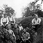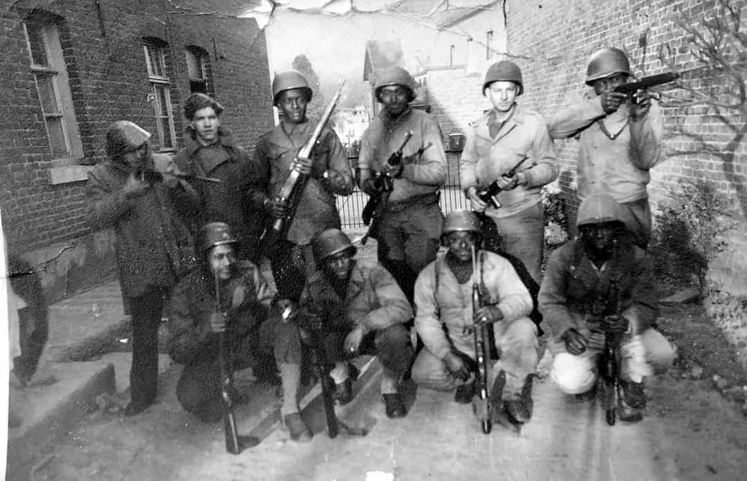 September 1944: Amerikaanse soldaten tijdens de bevrijding bij het huis van de familie Vrancken in Oud-Valkenburg. Op de achtergrond de pastorie van de kerk van Oud Valkenburg.